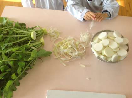 野菜を切る時の音やにおい,焚いている時の香りなど,様々なことを五感で感じたり,
