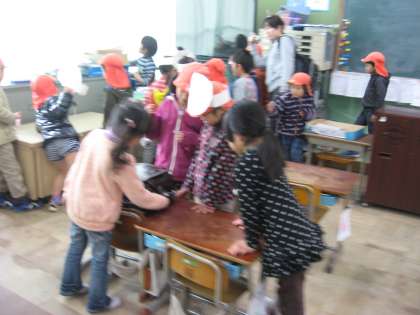 教室に入るなり,年長さんはやっぱりランドセルが目に留まりました。すると,1年生がしょわせてあげたり,机の上で開け閉めをさせてあげたりしていました。