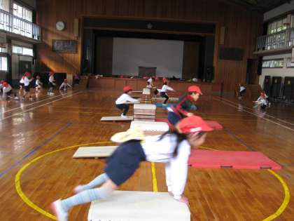 小学校に入って初めての,跳び箱を使った学習でした。どの子も,こわがったり嫌がったりせずに,一生懸命に取り組めました。大変素晴らしかったです。2年生の学習につながっていくことと思います。