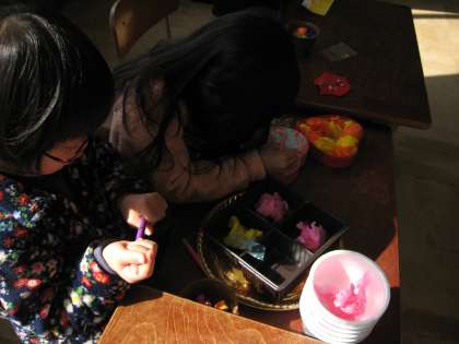 「ざいりょうぎんこう」の材料を使ってものを作ったり,コマを回したりして過ごしています。
