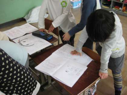 宿題プリントの裏に,楽しい‘イラスト’を描いている子が何人かいます。プリントの整理のついでに,ちょっと見合いながら交流しました。