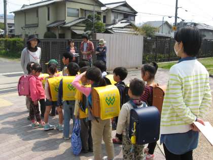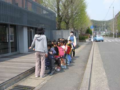 松ヶ崎児童館へ行く子どもたちは,児童館の職員の方がお二人付き添ってくださっています。学校を出る時だけでなく,道の途中でもいろいろと指導しながら引率してくださっていました。