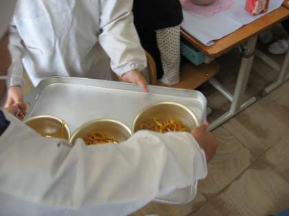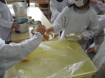 入れやすいように食器を渡したり,お盆で配膳したり,みんなで力を合わせてできました。待っている子も,給食当番の子の分を置いてあげていました。