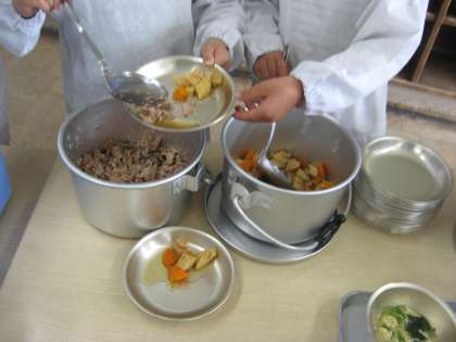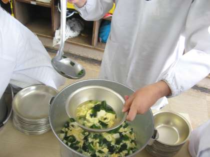 大きい器には「かきたまじる」を熱さに気をつけながら,パン皿には「なまぶし」と「たけのこの煮付け」を2人で息を合わせながら,上手に入れていました。