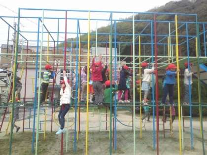 「遊具を握るときは,必ず親指と他の指で「輪っか」を作って棒を握ること。オーケー?輪っかを作らない握り方は‘アウチ’よ!」