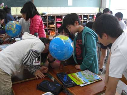 社会科の時間,地球儀をいろいろな方向から見て,たくさんの国を見つけました。