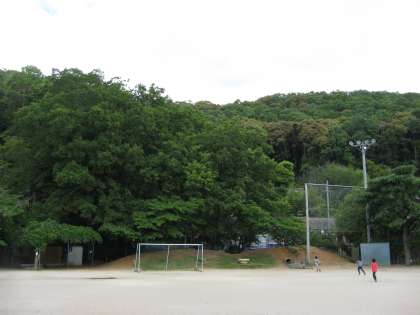 運動場から東を望めば,山々の美しい新緑が目に鮮やかにとび込んできます。