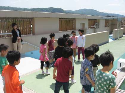 「うわぁ,屋上や!」 「あっ,プールや!」