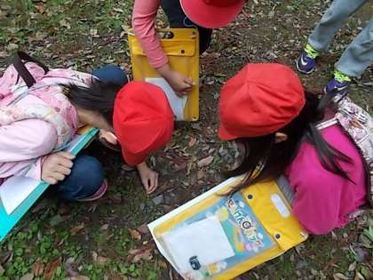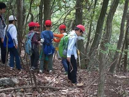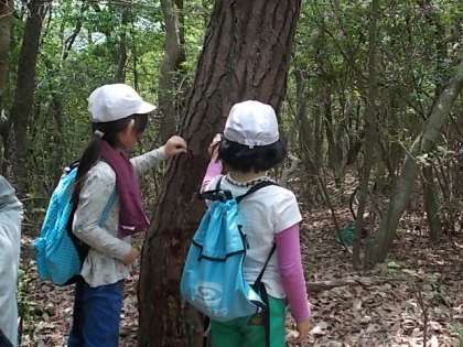 第2回目の活動です。今日は「虫」「道」「木」「鳥」「火床」など自分が調べたいテーマを決め,グループ毎に山探検をしました。