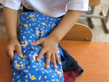 幼稚園・保育園等や,おうちで躾けられているようで,体育の服に着替えた後は,服をきちんとたたんでいます。習慣になっていれば,‘手が勝手に服をたたみ’ます。大事なことですね。
