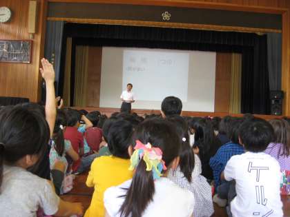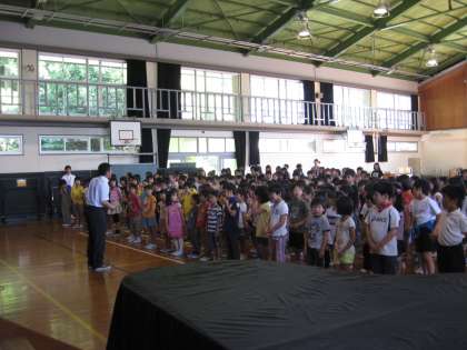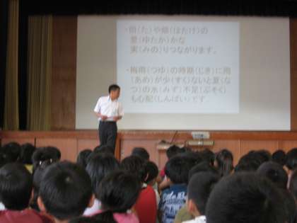 梅雨に入って雨の日が多くなる6月。雨の日の安全に気を付けて過ごすようにしようとの話がありました。1年生も,しっかり聞いていました。