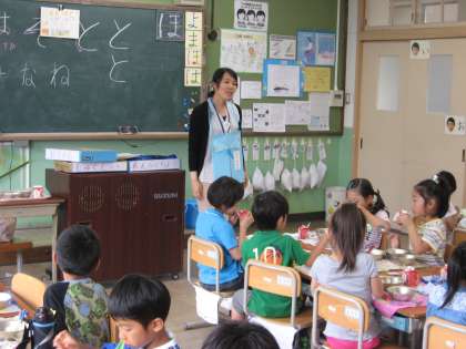 今日の給食の時間に1組は,栄養教諭から食について話を聞いて学びました。