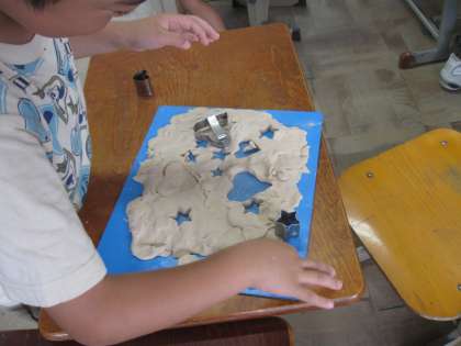 まずはねん土のかたまりを板状にのばしました。体重をかけてグイグイ広げていく子,ゲンコツや指先でドンドン・キュッキュッとのばしていく子。時間をかけてねん土の板ができたら,今度は,持ってきた材料でギュッと「かたおし」,ポン!と「かたぬき」をしました。