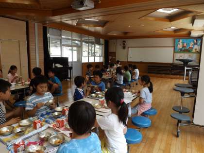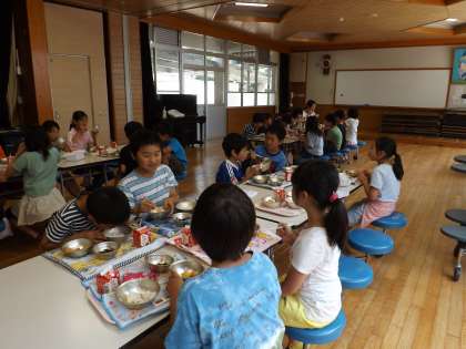 今日は4年1組の食育指導でした。ランチルームで給食をいただきました。栄養教諭の松崎先生からお話を聞きました。