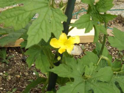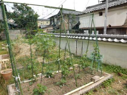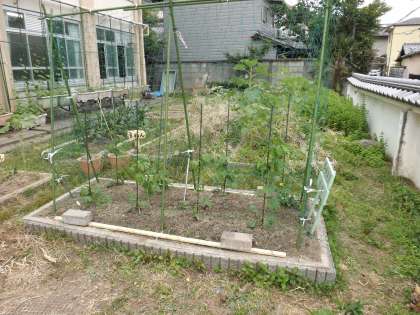 花壇に植えたツルレイシが少しずつ大きく育ってきました。管理用務員さんがとっても丈夫でステキなネットと支柱を作ってくださいました。時を重ねたように,黄色いかわいい花が咲きだしました。理科の観察がとってもやりやすくなりました。