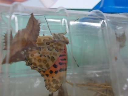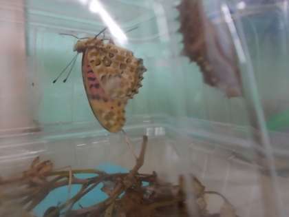 理科の観察でアゲハ蝶とツマグロヒョウモンを育てています。アゲハは,卵から観察し始め,幼虫からさなぎへと育ってきました。「もうすぐ成虫になるよ。」と観察をしながら,待ち焦がれていた子どもたちでした。そのさなぎが,先日,蝶になりました。
