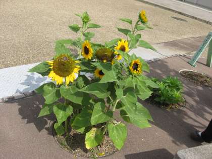 ちびっこ広場に咲いているひまわり。背丈が低いのでかわいいと,人気者です。