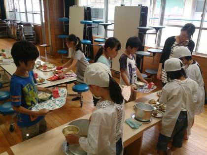 今日は4年2組の食育指導でした。ランチルームで給食をいただきました。
