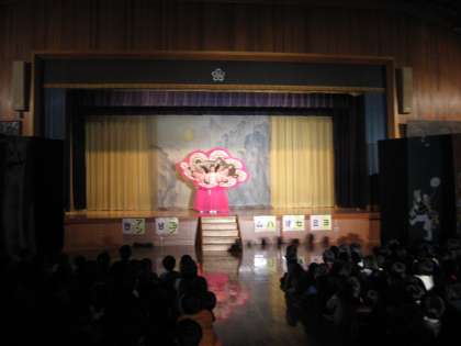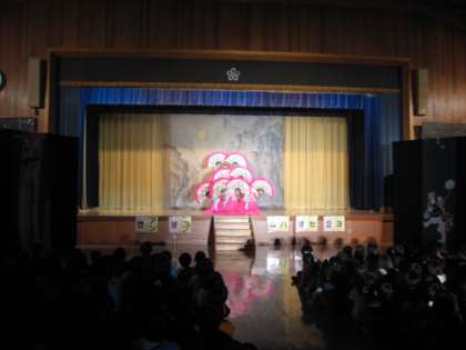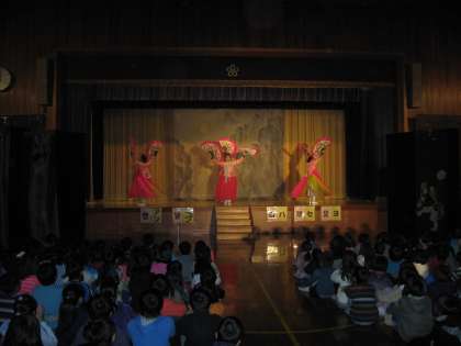 扇を使った美しい舞。「ポーズ」が決まると,子どもたちから大きな拍手が起こりました。