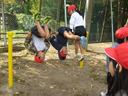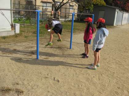 新技「自転車こぎ」に「足抜き下りの下りる前のがまん」。鉄棒を支えたり見守ったりしてくれている友だち,嬉しいですね。