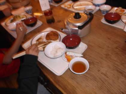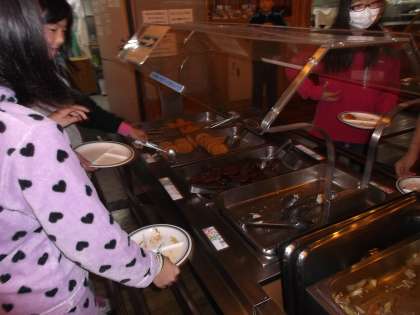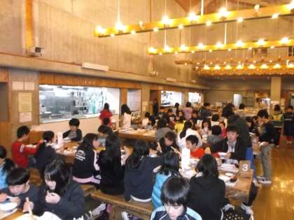 夕食の様子です。みんなおかわりをしてたくさん食べていました。コロッケ,串カツ,シュウマイ,ハンバーグ,生野菜など豪華な食事でした。