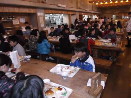 朝食の様子です。今日のおかずは少し和食系でした。パンを選ぶ子どもたちも半数ぐらいいました。