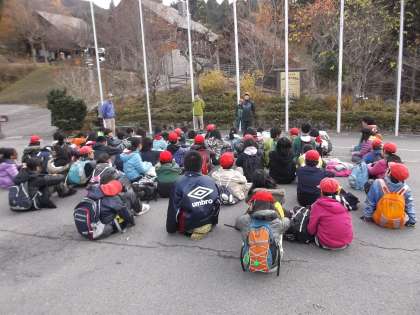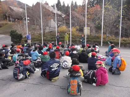 山の家に全員無事に到着です。全員元気に戻ってきました。到着の式をしました。所員の方から頑張りをほめていただきました。この体験で,またひとまわり大きくなりました。