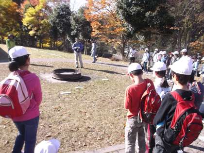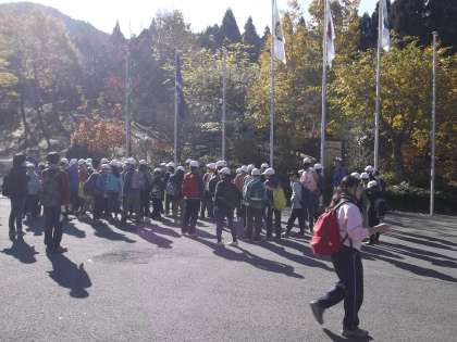 玄関前で登山の出発式をして、さあ出発です。体育館の前で山の家の所員の方に今日一日の登山コースの説明をしていただきました。