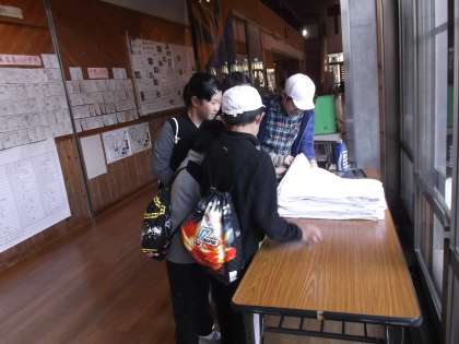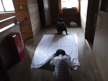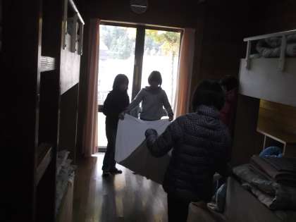3日目なのでシーツの交換です。みさきの家での経験がいかされていました。二人組で山の家のたたみ方通りにたためました。班でまとめてチェックを受けます。今日の夜は新しいシーツです。