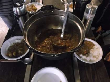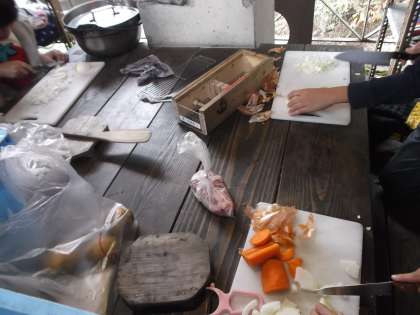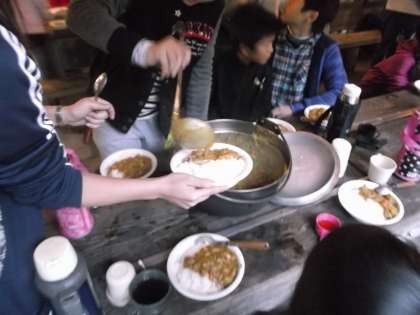 夕食は野外炊事場でのカレー作りです。材料を切るのも手慣れたものです。予定時間より大幅に早く調理できました。各班とも,とてもおいしいカレーを作ることができました。