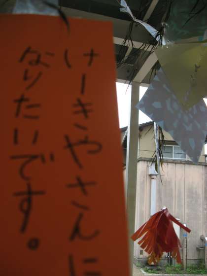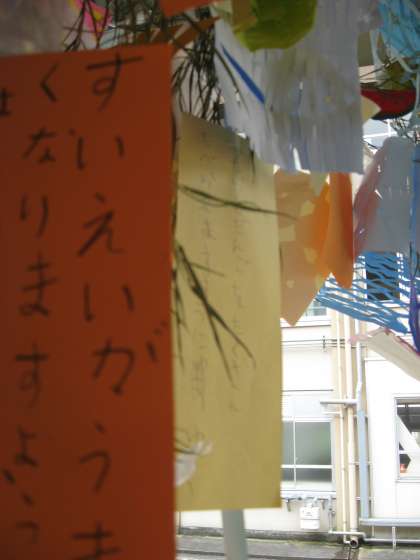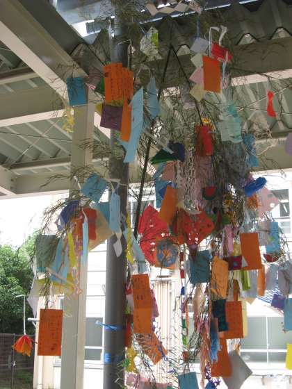 ささ飾りがきれいに飾られています。たくさんの願い事も付けられています。