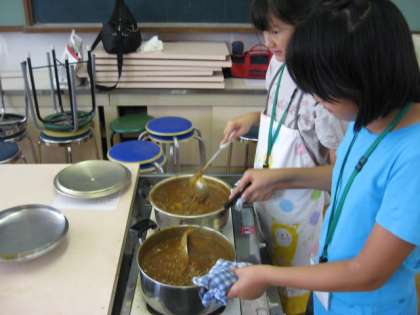 おいしいそうな匂いにつられて家庭科室に入ると,カレースタッフの皆さんが,むせかえるような室内で汗をふきふき,カレー作りに専念!