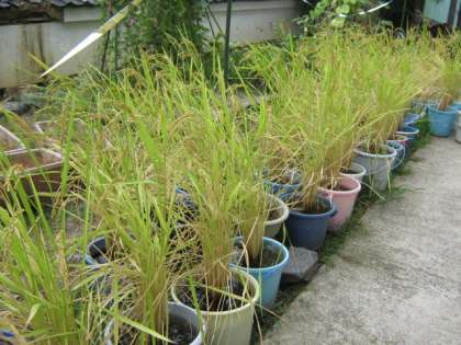 今年の猛暑にも何とか耐え,成長を続けるバケツ稲。