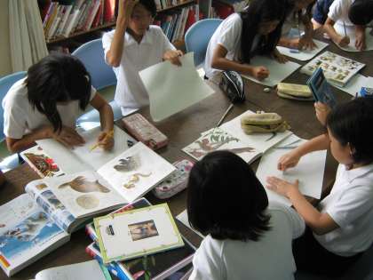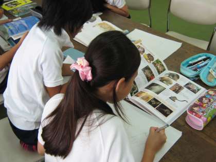 そこで,絵にしたい場面に現れる動物や植物などを図鑑などで調べ,スケッチをしました。