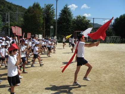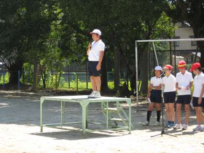 残暑が厳しい中,今日は初めての全校練習があり,入場や開会式,全校体操,団体競技などの練習をしました。