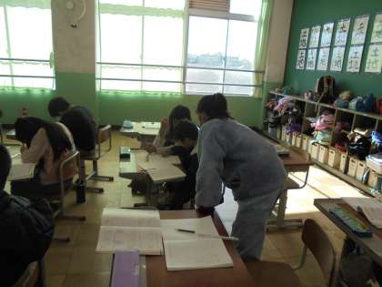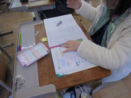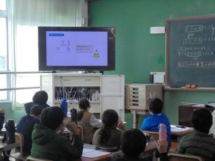 小数のかけ算の筆算を学習していました。ひっ算の書き方や仕方を教科書の二次元コードを読み取り、動画を見ながら確認をいていました。「掛け算の筆算と同じ、小数点を忘れずにかく」ということに気づくことができました。計算に挑戦です。