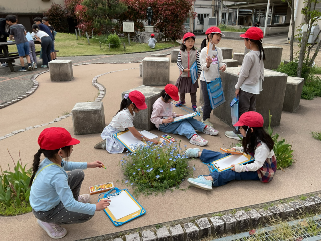 図工の「きせつをかんじて」では、学校の中の春を探しに行きました。