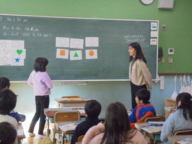 3年生は 「This is for you」の学習で、星はstar、 丸はcircleなど英語での言い方を学習しました。また、ほしいものを伝える言い方を学んでいました。今日はALTの先生と一緒に発音ややり取りの言い方を繰り返し練習していました。