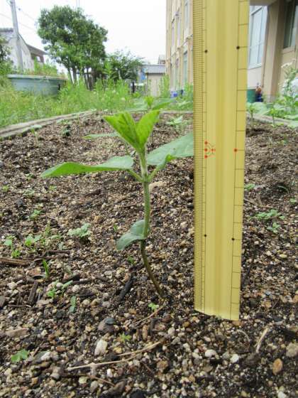 理科で育てているツルレイシのことをお伝えします。5月18日(月)は,せの高さが5センチメートル,葉の大きさが6センチメートルでした。今日は,せの高さが8センチメートル,葉の大きさが7センチメートルありました。だんだんと成長しているようすがわかりますね。また,理科の学習で高橋先生とくわしく学習をしていきましょう。