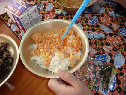 「さけずし」は,さけフレーク,にんじん,いり卵,いりごまの入ったすしの具を,各自がご飯に混ぜて,きざみ海苔をかけて食べました。さけずしの具は,米酢の他に料理酒や砂糖,塩,薄口醤油などで味付けされていて,さけずしにするとほんのりと酢の匂いや味がして,とってもおいしくいただくことができました。