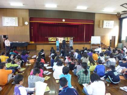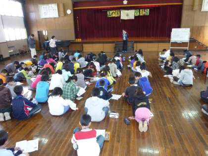 平成23年4月に小中一貫校「東山開睛館」として統合する,5つの小学校(白川・新道・六原・清水・東山の各小学校)の5年生約100人が本校講堂に集まり,11月1日(月)から5日(金)までの4泊5日,花背「山の家」で実施する野外活動の,最終となる第3回目の5校合同事前交流会を行いました。