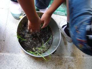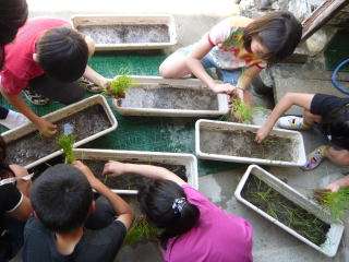 農家の方にいただいた稲の苗を使って,5年生の子どもたちがバケツやプランターなどに田植えをしました。