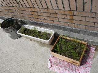 苗を植え終わったバケツやプランターは,運動場の一番日当たりのいい場所に置いています。順調に育って,秋においしいお米が収穫できるといいですね。