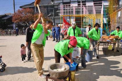 11月21日(日)午前10時から本校運動場で,東山少年補導委員会新道支部主催の「新道 もちつき大会」が開催され,たくさんの人で賑わいました。