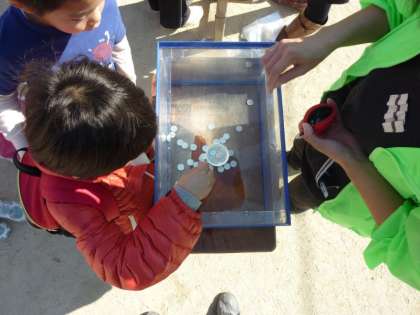 「新道もちつき大会」の終盤には,新道PTAのゲームコーナーが開設されました。水槽に水をいっぱい入れて湯飲みを沈め,一円玉をその湯飲みに入れるという,「コイン玉落とし」のゲームでした。一人1回,低学年から順に挑戦しましたが,なかなか湯飲みの中に入らず,難しいゲームのようでした。湯飲みに一円玉が見事に入ると,お菓子のつかみ取りができました。