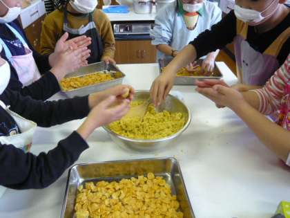 2年生の子どもたちが,屋上の学級園で育てた「サツマイモ」を収穫して,サツマイモの料理を2種類つくりました。
