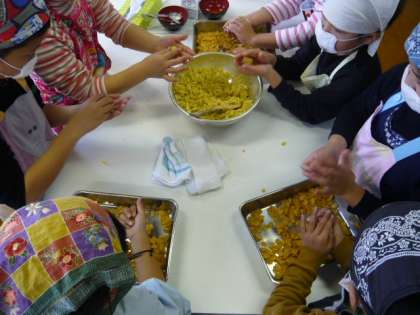 2年生の子どもたちは,切ったり,混ぜたり,丸めたり,とっても楽しそうに調理をしていました。
