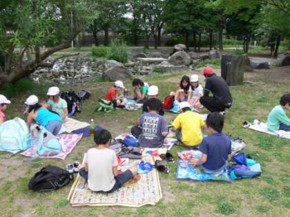 梅小路公園では弁当を食べたり,「河原遊び場」や「芝生広場」で遊んだりしました。