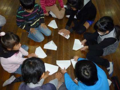 今日の児童集会は「つくって遊ぼう集会」で,なかよしグループの6年生のリーダーの指導で「紙飛行機」をつくって遊びました。A4サイズの紙を配ってもらって,6年生のリーダーが折っていくのをしっかりと見て,紙飛行機をつくっていきました。