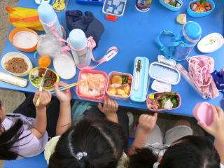 手をきれいに洗った後は,お楽しみのお弁当の時間でした。グループごとにお弁当を広げ「いただきます」,卵焼きや唐揚げ,ウインナーソーセージ,肉団子など好物ばかりが入っていました。デザートもたっぷりあって,みんなでおいしくお弁当をいただきました。